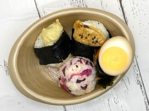 野菜天むす3個/味付け玉子/わかめと人参の酢の物