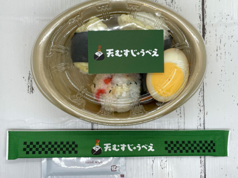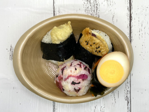 2パターンから選べる野菜天むす3種に、特製味玉、わかめと人参の酢の物のセットです。それぞれの野菜の食感や味わいをお楽しみください
