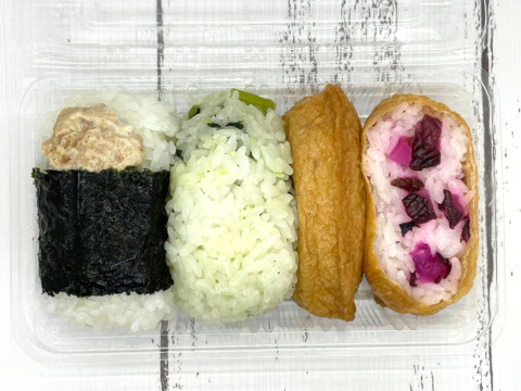 手握りのふんわりおにぎり2個と、いなり寿司2個のお得なセットです。おにぎりだけでは物足りないかたはこちらをお選びください。