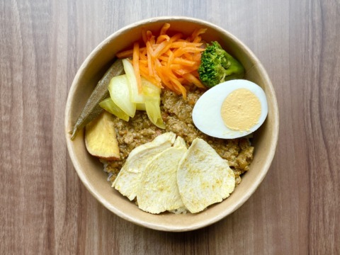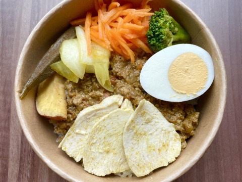 低温調理でじっくり仕上げた自家製のサラダチキンとひき肉たっぷりのスパイシーなドライカレーです。