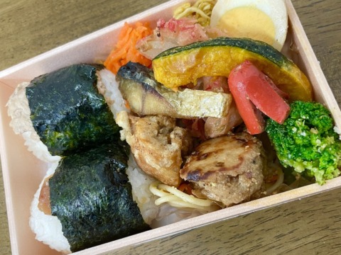 選べる俵おにぎり2つ/鶏の唐揚げ/手作り肉団子/サバの塩焼き/味玉/シャキシャキにんじんのサラダ/切り干し大根のピリ辛カレー南蛮/わさびポテサラ/ブロッコリーのペペロンチーノ/タコさんウインナー/かぼちゃの素揚げ/玉ねぎと紅しょうがの天ぷら/パスタチャンプルー