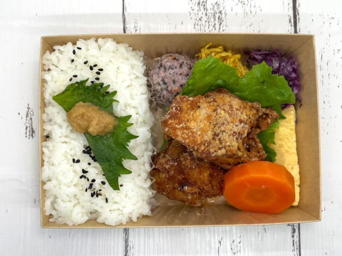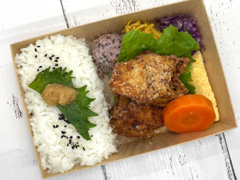 味噌漬け鶏の唐揚げ/自家製だし巻き玉子/ゆかりれんこんのポテトサラダ/切り干し大根のピリ辛カレー南蛮/紫キャベツの和風コールスロー/にんじんの梅煮/玉ねぎ味噌と大葉/ご飯[約200g]