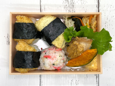 3パターンから選べる天むす4種と、とり味噌マスタード焼き、だし巻き玉子、パスタチャンプル、さつマヨサラダ、わかめと人参の酢の物、かぼちゃの素揚げがセットになった天むす弁当です。