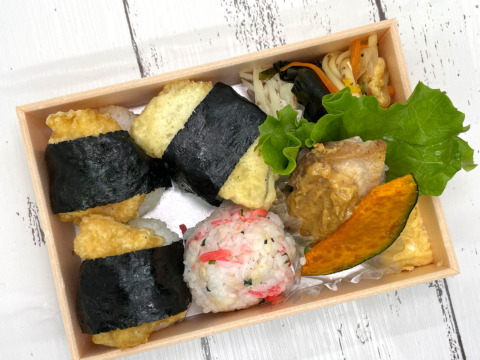天むす4個/とり味噌マスタード焼き/だし巻き玉子/パスタチャンプル/さつマヨサラダ/わかめと人参の酢の物/かぼちゃの素揚げ