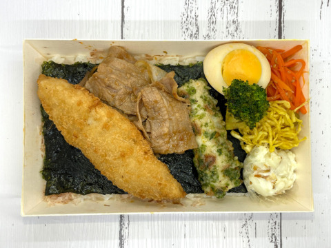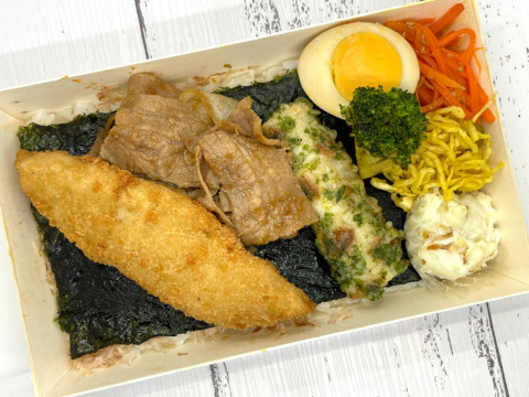 タルタル&ソースがついた白身魚のフライとご飯にもぴったりの豚の生姜焼きをダブルでご用意しました。のり助自慢の手作り惣菜がさらにお弁当を彩ります。有明海産の海苔と、鹿児島県近海一本釣りカツオのかつお節を使用したこだわり海苔弁です。