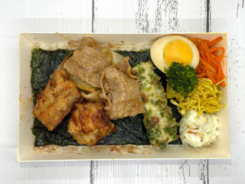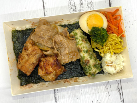豚の生姜焼きと鶏の唐揚げをダブルで!一折の容器に2種のお肉が並び、欲張りさんには持ってこいです。もちろんのり弁はひとつひとつの素材にこだわる自信作となっております。