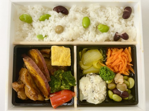 選べる混ぜご飯と、鶏とさつまいものハニーマスタードをメインに、パンプキンだし巻きやオリーブポテサラ、ナポリタンなど、多彩な7種の惣菜が彩り鮮やかに盛り付けられ、バラエティ豊かな味わいが楽しめます。和洋折衷のさまざまなおかずを楽しめるカワイイお弁当をお楽しみください。