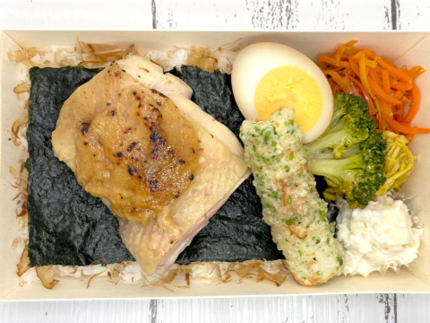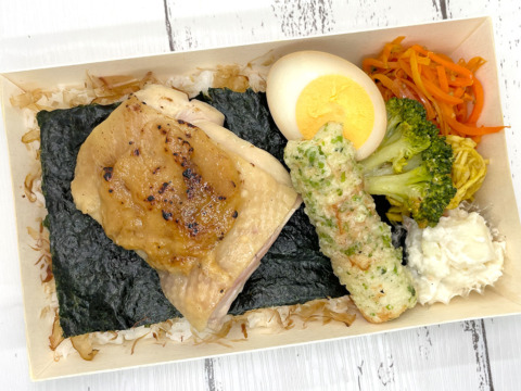 低温調理しながら味噌漬けした鶏肉の炙り焼きをメインに、野菜いっぱいのヘルシーな手作り惣菜が彩ります。有明海産の海苔と、鹿児島県近海一本釣りカツオのかつお節を使用したこだわり海苔弁です。
