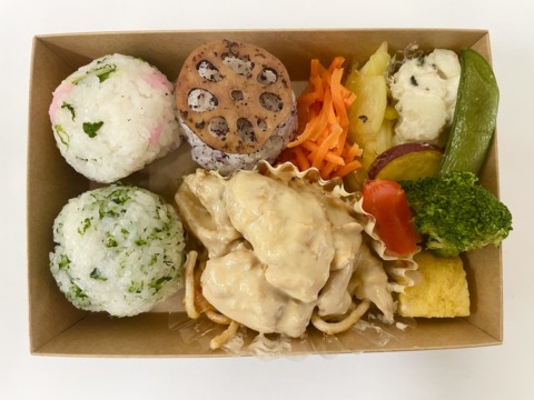 3種のまるコロおにぎりと鶏肉の味噌クリーム煮のセット。美味しさとかわいらしさも兼ね備えたお弁当です。和洋の味付けの手作りのお惣菜も合わせてどうぞ。