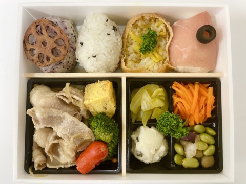 「A:生ハムにぎり・カレーたくあんのいなり寿司・オリーブ&オリーブおにぎり・ゆかりれんこんのおにぎり」