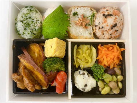 色とりどりの4種の俵おにぎりと、鶏とさつまいもののハニーマスタード。すべて手作りのこだわり和洋惣菜が自慢のお弁当です。